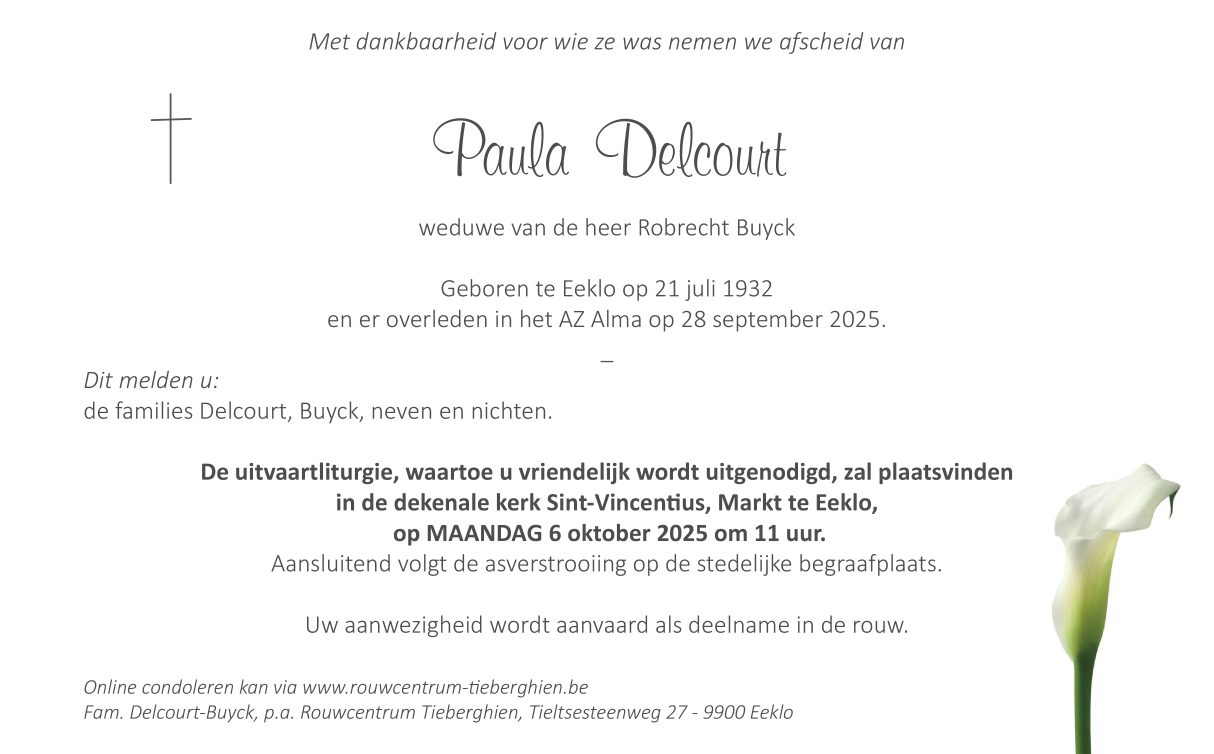 Overleden te Eeklo (9900) op zondag 28 september 2025 op 93-jarige leeftijd