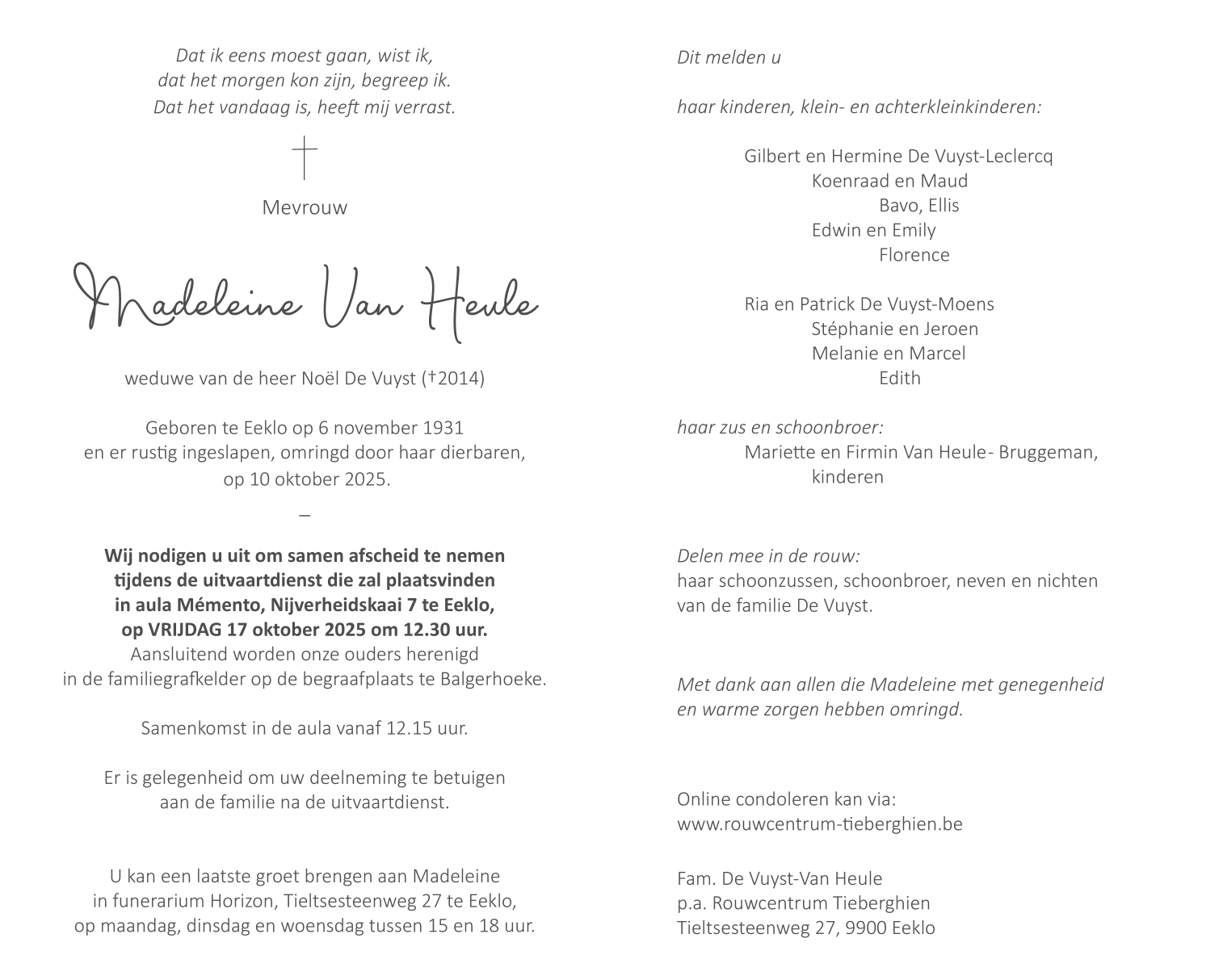 Overleden te Eeklo (9900) op vrijdag 10 oktober 2025 op 93-jarige leeftijd