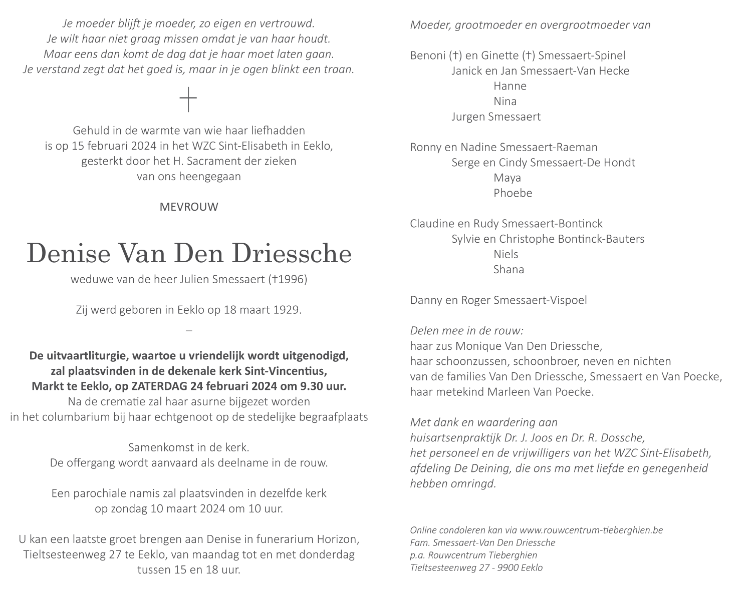Overleden te Eeklo (9900) op donderdag 15 februari 2024 op 94-jarige leeftijd