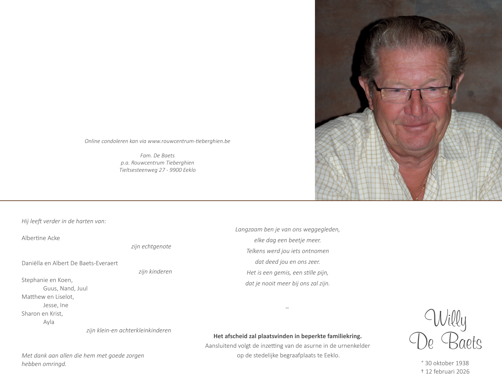Overleden te Eeklo (9900) op donderdag 12 februari 2026 op 87-jarige leeftijd