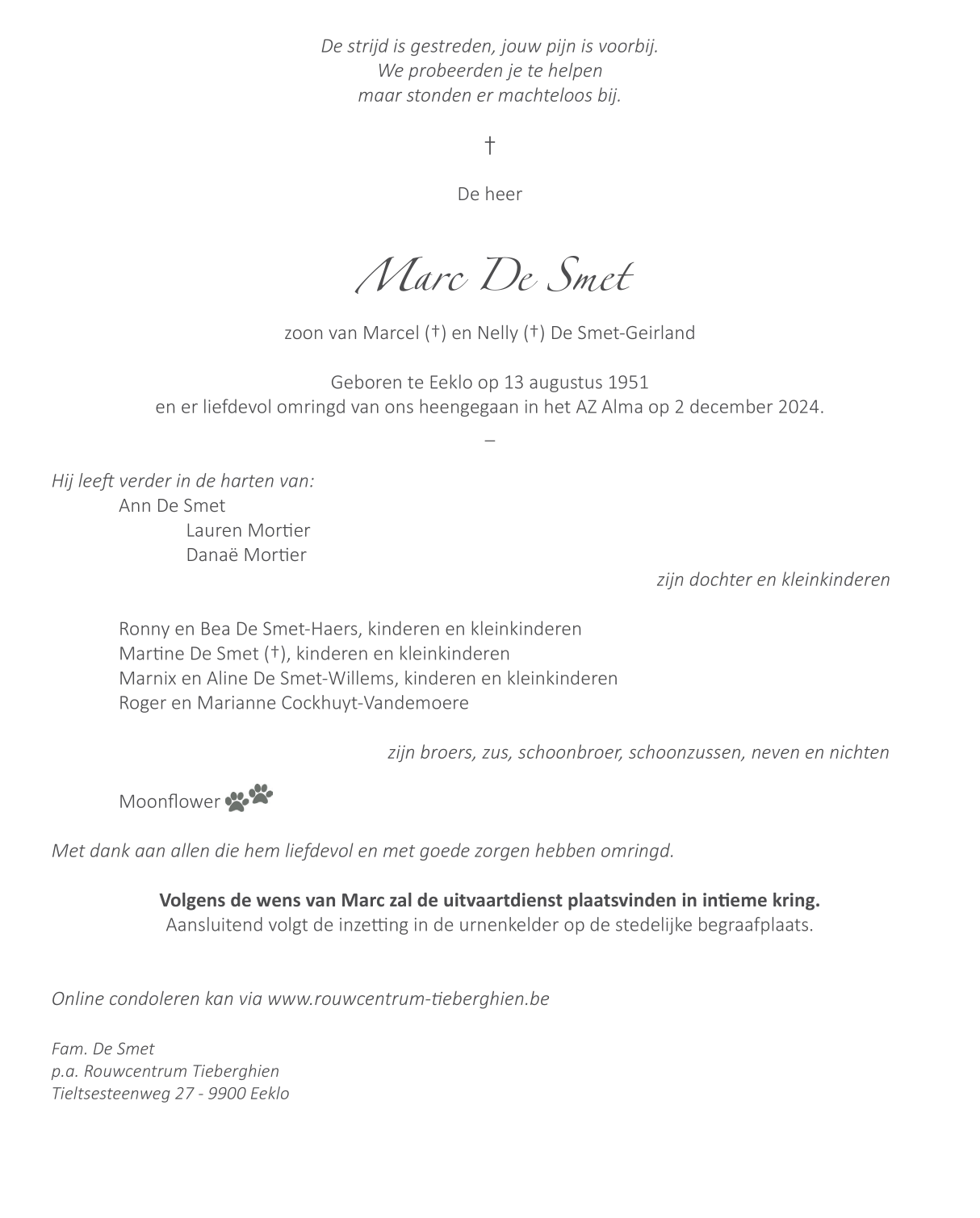 Overleden te Eeklo (9900) op maandag 2 december 2024 op 73-jarige leeftijd