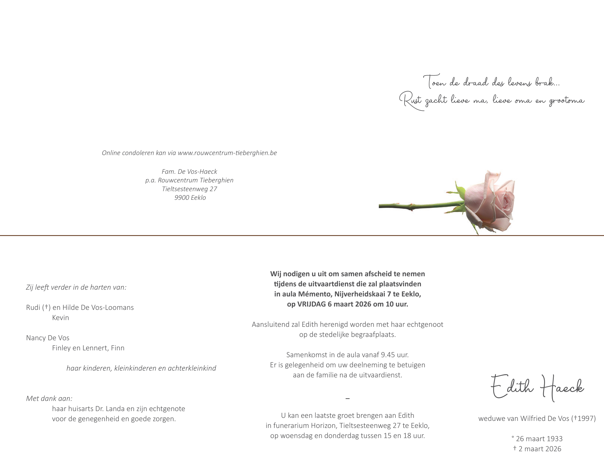 Overleden te Eeklo (9900) op maandag 2 maart 2026 op 92-jarige leeftijd