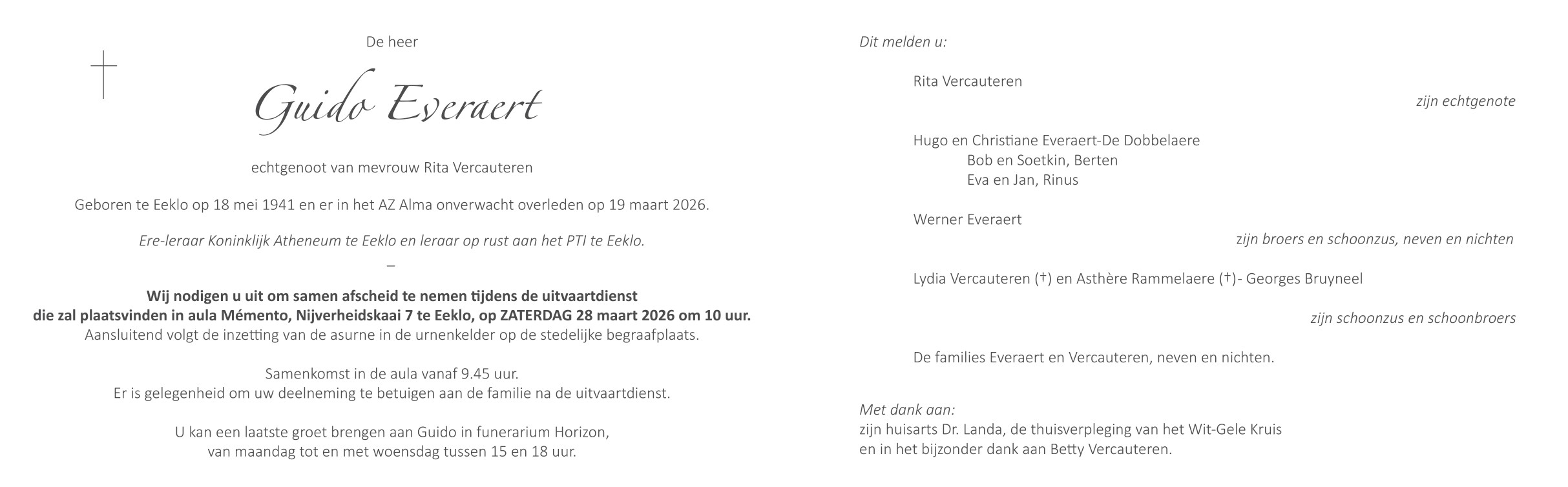 Overleden te Eeklo (9900) op donderdag 19 maart 2026 op 84-jarige leeftijd